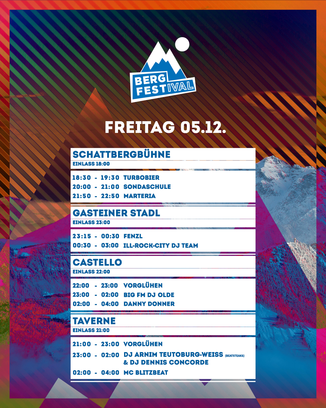 Mit den Donots, den H-Blockx, Turbobier, Sondaschule und Arnim Teutoburg-Weiss sind bereits BERGFESTival begeisterte Bands / Künstler am Start und sie wissen warum sie gerne wiederkommen. Sechs Locations, die abwechslungsreicher nicht sein könnten und eine enthusiastische Crowd, die jede Band, jede Location gleichermaßen feiert. Danke an Euch! Zum 1. Mal dabei sind dieses Jahr Marteria, Blackout Problems und Brew Barrymore. Weitere Acts folgen in Kürze.