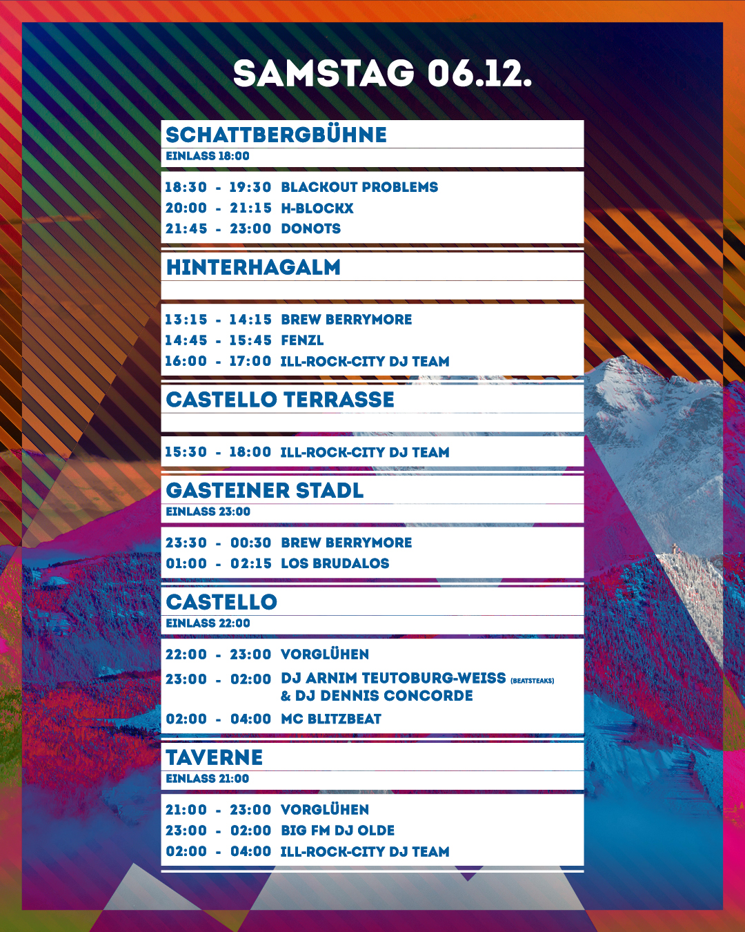 Die Abendkasse / Bändertausch befindet sich direkt am Eingang zur Schattbergbühne (Talstation Schattberg X-press). Die Kassen sind am Freitag ab 16:30 Uhr und am Samstag ab 17:00 Uhr geöffnet.